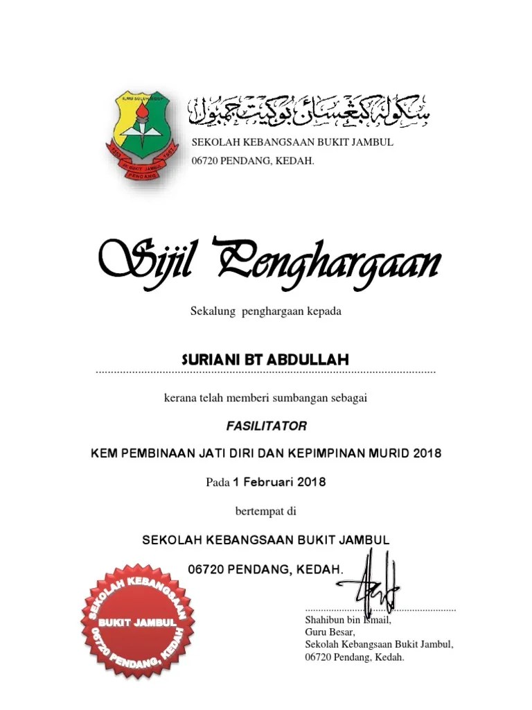Sijil penghargaan dengan ini diperakui bahawa telah memberikan sumbangan sepenuh komitmen sebagai bagi yang telah.